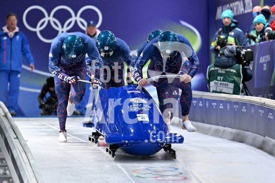 2891966 Cortina d'Ampezzo, Italia, 21 de fevereiro de 2026. Brad Hall, Greg Cackett, Leon Greenwoo e Taylor Lawrence, da Gra-Bretanha, em acao durante a primeira bateria da prova de bobsleigh de quatro homens dos Jogos Olimpicos de Inverno de 2026 em Cortina d'Ampezzo, Italia. (Foto de Igor Kupljenik/Sports Press Photo) (Igor Kupljenik / SPP)