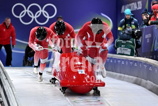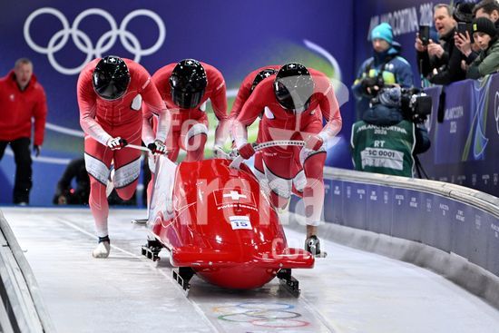 2891971 Cortina d'Ampezzo, Italia, 21 de fevereiro de 2026. Timo Rohner, Pascal Moser, Mathieu Hersperger e Cyril Bieri, da Suica, em acao durante a primeira bateria da prova de bobsleigh de quatro homens dos Jogos Olimpicos de Inverno de 2026 em Cortina d'Ampezzo, Italia. (Foto de Igor Kupljenik/Sports Press Photo) (Igor Kupljenik / SPP)
