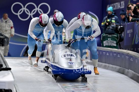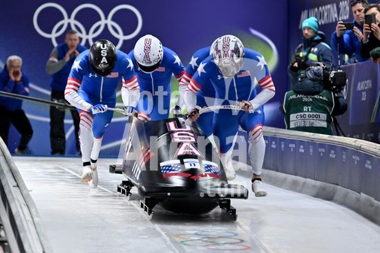 2891986 Cortina d Ampezzo, Italia, 21 de fevereiro de 2026. Frankie Duca, Boone Niederhofer, Bryan Sosoo, Joshua Williamson dos Estados Unidos da America em acao durante a corrida Bobsleight 4-man Heat 1 dos Jogos Olimpicos de Inverno de 2026 em Cortina d Ampezzo, Italia. (Foto de Igor Kupljenik/Sports Press Photo) (Igor Kupljenik / SPP)