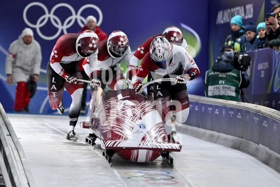 2891973 Cortina d Ampezzo, Italia, 21 de fevereiro de 2026. Jekabs Kalenda, Lauris Kaufmanis, Matiss Miknis, Mairis Klava da Letonia em acao durante a corrida Bobsleight 4-man Heat 1 dos Jogos Olimpicos de Inverno de 2026 em Cortina d Ampezzo, Italia. (Foto de Igor Kupljenik/Sports Press Photo) (Igor Kupljenik / SPP)