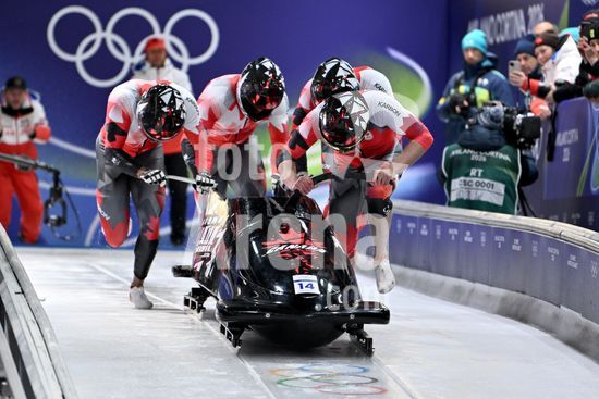 2891974 Cortina d'Ampezzo, Italia, 21 de fevereiro de 2026. Jay Dearborn, Yohan Eskrick-Parkinson, Luka Stoikos e Mark Zanette, do Canada, em acao durante a primeira bateria da prova de bobsleigh de quatro homens dos Jogos Olimpicos de Inverno de 2026 em Cortina d'Ampezzo, Italia. (Foto de Igor Kupljenik/Sports Press Photo) (Igor Kupljenik / SPP)