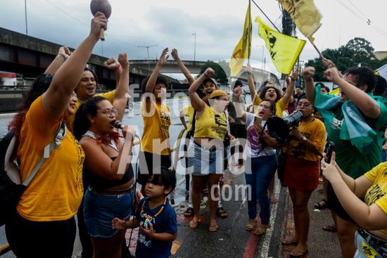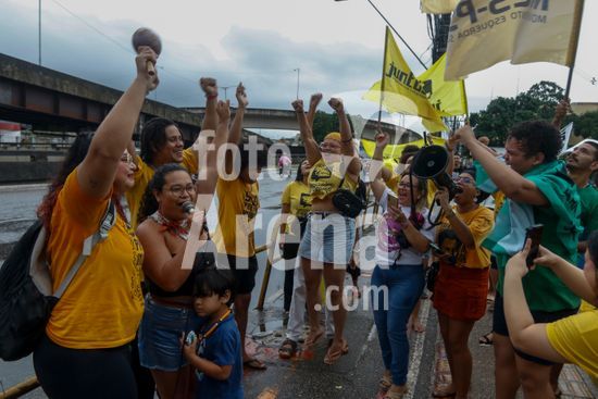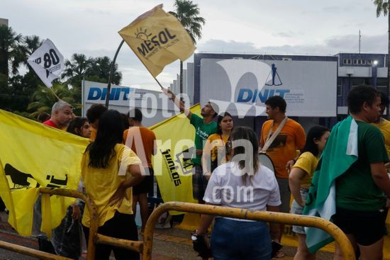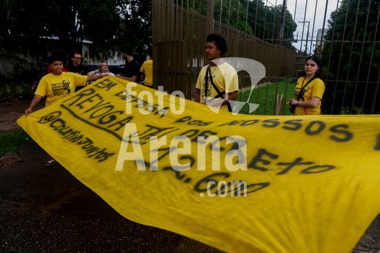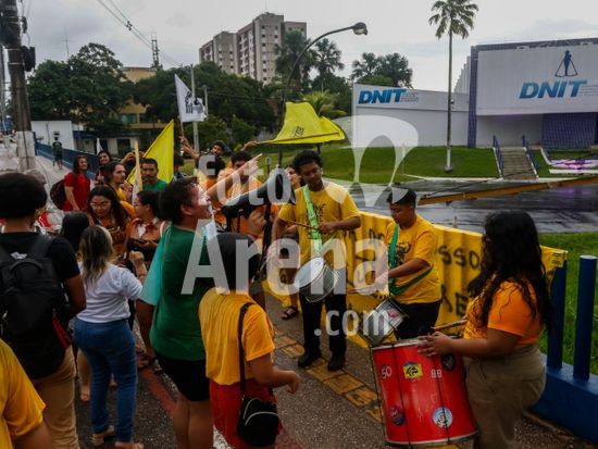 2893794 Governo Federal revoga Decreto 12.600 após reunião com lideranças indígenas em Brasília. Ato em defesa dos Rios em frente à sede da Superintendência do DNIT no Pará. Sob chuva integrantes da sociedade civil, indígenas, estudantes e entidades de direitos humanos comemoram a revogação do decreto 12600 que dispõe sobre a inclusão de empreendimentos públicos federais do setor hidroviário no Programa Nacional de Desestatização.