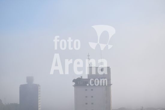 2906435 Neblina. Climatempo. Céu com névoa e ensolarado. Neblina e clima seco em dia na capital na manhã do sábado (14). Na foto, prédios residenciais encobertos por neblina.