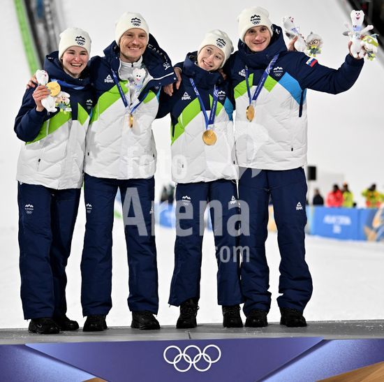 2881846 Predazzo, Italia, 10 de fevereiro de 2026. A equipe da Eslovenia comemora o primeiro lugar e a medalha de ouro apos a competicao de salto de esqui por equipes mistas em pista normal dos Jogos Olimpicos de Inverno de 2026 em Predazzo, Italia. (Foto de Igor Kupljenik/Sports Press Photo) (Igor Kupljenik / SPP)