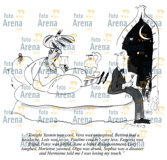 PCL108195 "Tonight Yasmin was cool, Vera was uninspired, Bettina had a headache, Lois was so-so, Pauline couldn't care less, Eugenia was frigid, Patsy was pitiful, Jane a bitter disappointment, Lucy laughed, Hortense yawned, Olga was drunk, Sophia was a disaster and Hermione told me I was losing my touch." *** Local Caption *** Punch cartoons by Michael ffolkes (Brian Davis)