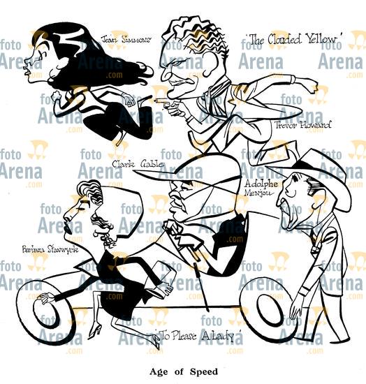 PCL113461 "Age of Speed..To Please a Lady ; Barbara Stanwyck , Clark Gable and Adolphe Menjou..The Clouded Yellow ; Jean Simmons and Trevor Howard" *** Local Caption *** "Celebrity caricatures of stars of Film, Arts, Sport in Punch magazine by R S Sherriffs"