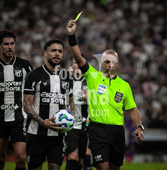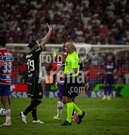 2837146 O árbitro Wilton Pereira Sampaio aplica cartão amarelo - Partida entre Ceará e Fortaleza, válida pela 32ª rodada do Campeonato Brasileiro Série A 2025, realizada na Arena Castelão, em Fortaleza, capital cearense, na noite desta quinta-feira (6).