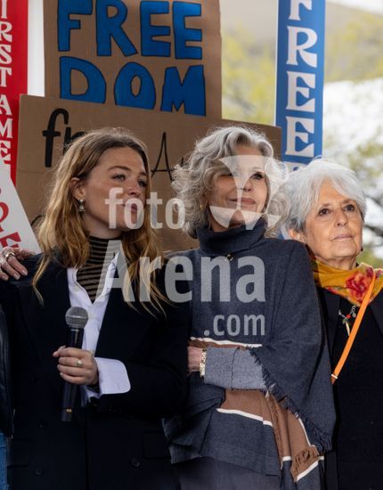 ny270326194412 From left: Maggie Rogers, Jane Fonda and Joan Baez during an event titled ?Artists United for Our Freedom? hosted by the Committee for the First Amendment outside the Kennedy Center in Washington, on Friday, March 27, 2026. The gathering of artists and others denounced censorship and faulted President Trump?s growing influence over the nation?s cultural life. (Alex Kent/The New York Times/Fotoarena)