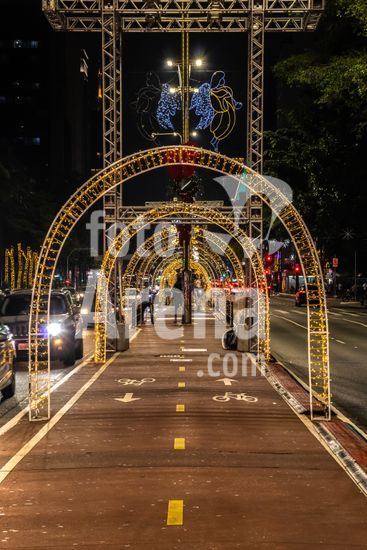 2862817 Natal Iluminado na ciclovia da Avenida Paulista, um dos principais centros financeiros e culturais do país.. A via, exclusiva para bicicletas, é transformada em um túnel de luzes douradas, criando um cenário festivo e convidativo em meio ao intenso tráfego noturno da metrópole. A imagem retrata a coexistência entre a mobilidade urbana sustentável, a celebração cultural e a vida noturna de uma das maiores cidades do mundo, sendo um exemplo de como os espaços públicos são ressignificados em datas comemorativas.