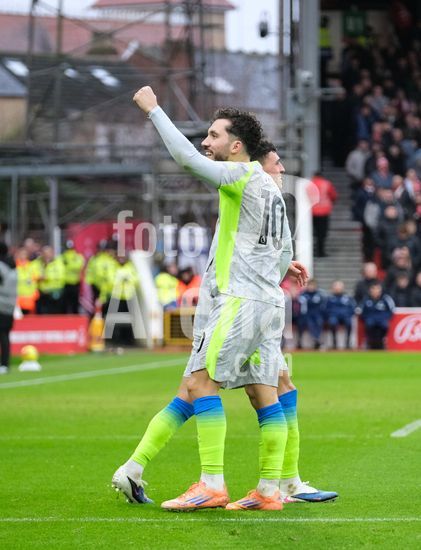 2863269 Rayan Cherki, do Manchester City, comemora seu gol aos 83 minutos, que garantiu o placar de 1 a 2 durante a partida da Premier League entre Nottingham Forest e Manchester City, no City Ground, em Nottingham. (Paul Bonser/Sports Press Photo / SPP)