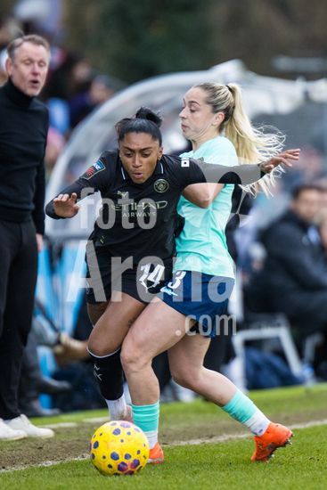 2873658 Kerolin Nicoli (14 Manchester City) sofre falta na lateral cometida por Poppy Pattinson (3 London City Lionesses) durante a partida entre London City Lionesses e Manchester City pela Superliga Feminina, no CopperJax Community Stadium, em Bromley, Londres, Inglaterra, no domingo, 25 de janeiro de 2026. (Claire Jeffrey / SPP)