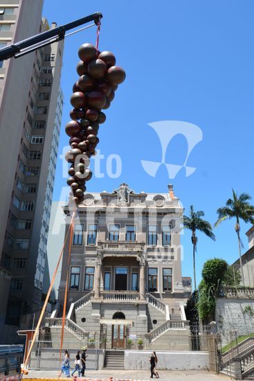 2879139 Imagens de um enorme cacho de uvas, instalado na Praça Dante Alighieri, no Centro de Caxias do Sul, em frente a Catedral de Santa Teresa, com seis metros de altura, ficará suspenso por um guincho, chamando a atenção para o evento que se inicia no dia 19 deste mês. A escultura tem a assinatura do artista André Gnatta, da Gnatta Studios 3di. A decoração se soma a alteração das cores do túnel de LED, que já está em roxo e verde, também remetendo a uma das maiores Festas Comunitárias do país. Caxias do Sul, RS (04).