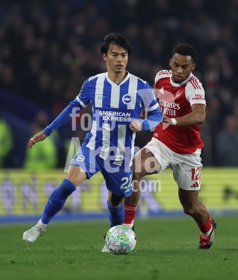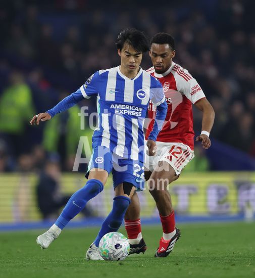 2898233 BRIGHTON, INGLATERRA, 4 DE MARCO: Kaoru Mitoma, do Brighton & Hove Albion, disputa a bola com Jurrien Timber, do Arsenal, durante a partida entre Brighton & Hove Albion FC e Arsenal FC pela Premier League, no AMEX Community Stadium, em Brighton, Inglaterra, em 4 de marco. (Daniel Weir/SPP)
