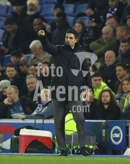 2898338 BRIGHTON, INGLATERRA, 4 DE MARCO: Mikel Arteta, tecnico do Arsenal, da instrucoes aos seus jogadores durante a partida entre Brighton & Hove Albion FC e Arsenal FC, valida pela Premier League, no AMEX Community Stadium, em Brighton, Inglaterra, no dia 4 de marco. (Foto de Daniel Weir) (Daniel Weir/Sports Press Photo / SPP)