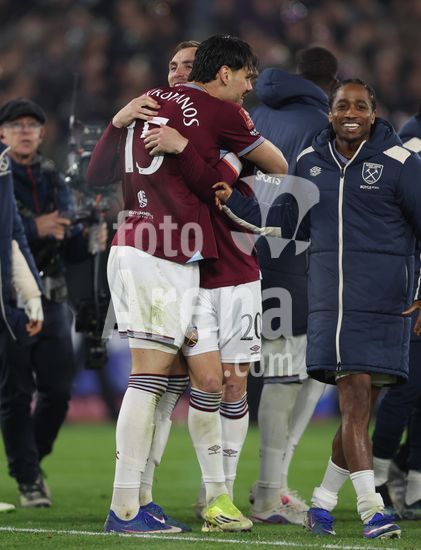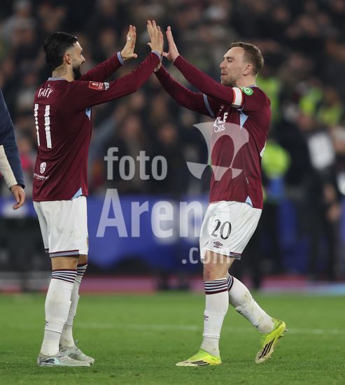 2902207 LONDRES, INGLATERRA, 9 DE MARCO: Jarrod Bowen, do West Ham United, comemora a vitoria nos penaltis com Konstantinos Mavropanos, tambem do West Ham United, durante a partida entre West Ham United FC e Brentford FC, valida pela 5ª rodada da Copa da Inglaterra (Emirates FA Cup), no Estadio Olimpico de Londres, em Londres, Inglaterra, em 9 de marco. (Foto de Daniel Weir) (Daniel Weir/Sports Press Photo / SPP)