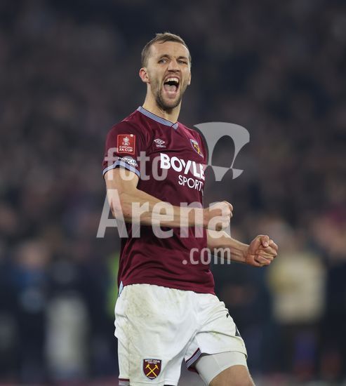 2902143 LONDRES, INGLATERRA, 9 DE MARCO: Tomas Soucek, do West Ham United, comemora com um soco no ar apos a vitoria do West Ham United nos penaltis durante a partida entre West Ham United FC e Brentford FC, valida pela 5ª rodada da Copa da Inglaterra (Emirates FA Cup), no Estadio Olimpico de Londres, em Londres, Inglaterra, em 9 de marco. (Foto de Daniel Weir) (Daniel Weir/Sports Press Photo / SPP)
