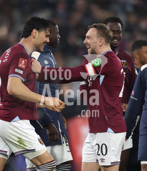 2902147 LONDRES, INGLATERRA, 9 DE MARCO: Jarrod Bowen, do West Ham United, comemora com Konstantinos Mavropanos, tambem do West Ham United, apos a vitoria nos penaltis durante a partida entre West Ham United FC e Brentford FC, valida pela 5ª rodada da Copa da Inglaterra (Emirates FA Cup), no Estadio Olimpico de Londres, em Londres, Inglaterra, em 9 de marco. (Foto de Daniel Weir) (Daniel Weir/Sports Press Photo / SPP)