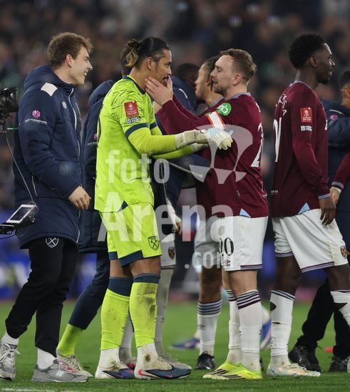 2902221 LONDRES, INGLATERRA, 9 DE MARCO: Jarrod Bowen, do West Ham United, comemora a vitoria nos penaltis com Alphonse Areola, tambem do West Ham United, durante a partida entre West Ham United FC e Brentford FC, valida pela 5ª rodada da Copa da Inglaterra (Emirates FA Cup), no Estadio Olimpico de Londres, em Londres, Inglaterra, em 9 de marco. (Foto de Daniel Weir) (Daniel Weir/Sports Press Photo / SPP)