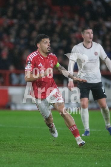2903523 Mads Bech Sorensen, do FC Midtjylland, e Omari Hutchinson, do Nottingham Forest, em acao durante a partida de futebol da Liga Europa da UEFA entre Nottingham Forest e FC Midtjylland, no City Ground, em Nottingham. (Paul Bonser / Sports Press Photo / SPP)