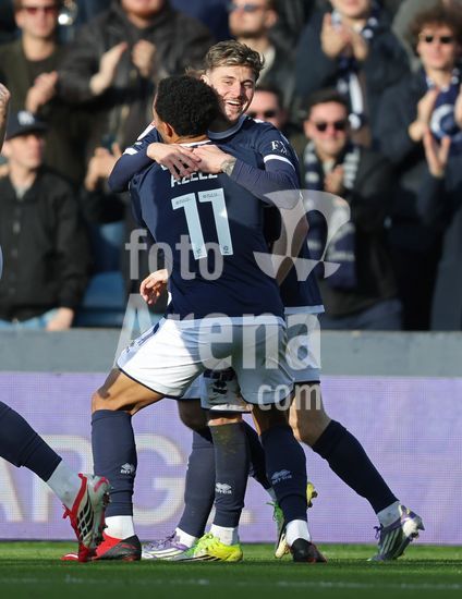 2904289 LONDRES, INGLATERRA, 14 DE MARCO: GOL 1-0, Luke Cundle, do Millwall, comemora o gol com Femi Azeez, tambem do Millwall, apos marcar o gol que colocou o Millwall em vantagem por 1 a 0 durante a partida entre Millwall FC e Blackburn Rovers FC, valida pelo Sky Bet Championship, no Estadio The New Den, em Londres, Inglaterra, em 14 de marco. (Foto de Daniel Weir) (Daniel Weir/Sports Press Photo / SPP)