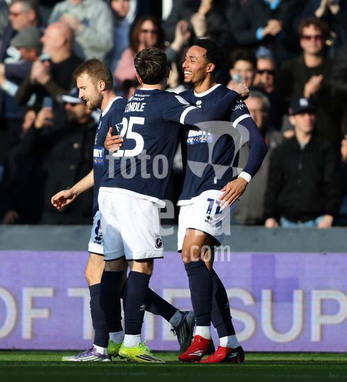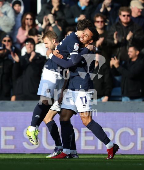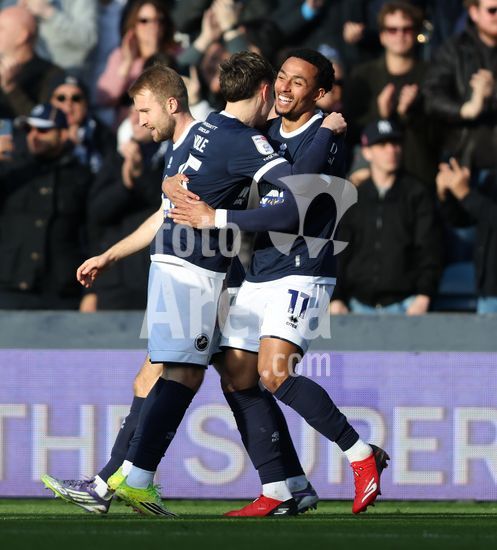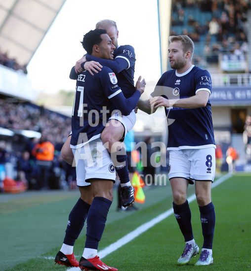 2904317 LONDRES, INGLATERRA, 14 DE MARCO: GOL 1-0, comemoracao de Femi Azeez, do Millwall, com Barry Bannan, tambem do Millwall, apos Luke Cundle marcar o gol que colocou o Millwall em vantagem por 1-0 durante a partida entre Millwall FC e Blackburn Rovers FC, valida pelo Sky Bet Championship, no Estadio The New Den, em Londres, Inglaterra, em 14 de marco. (Foto de Daniel Weir) (Daniel Weir/Sports Press Photo / SPP)