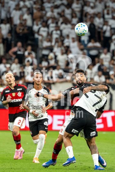 2910319 SAO PAULO, BRAZIL - MARCH 22: Lucas Paqueta do Flamengo (E) e Matheus Bidu do Corinthians (D) disputam a bola durante a partida entre Corinthians x Flamengo, válida pela oitava rodada do Campeonato Brasileiro de Futebol 2026, neste domingo (22), na Neo Química Arena, SP.