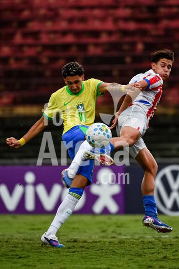 2916226 Isaque do Brasil e Thiago Aranda do Paraguai disputando a bola durante partida entre Brasil x Paraguai, amistoso da categoria Sub 20, nesta terça feira (31) no Estádio do Canindé, SP.