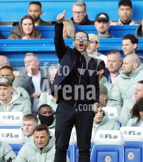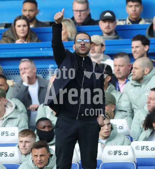 2918856 LONDRES, INGLATERRA, 4 DE ABRIL: Liam Rosenior, tecnico do Chelsea, gesticula com o polegar para cima para seus jogadores durante a partida entre Chelsea FC e Port Vale FC, valida pelas quartas de final da Copa da Inglaterra (Emirates FA Cup), no Estadio Stamford Bridge, em Londres, Inglaterra, em 4 de abril. (Daniel Weir/Sports Press Photo / SPP)