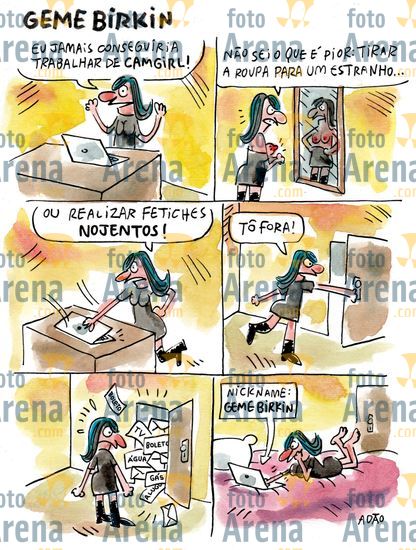 aigb23001 ADÃO ITURRUSGARAI, GAME BIRKIN, CORREIO ELEGANTE, 2023.DiálogoGame Birkin- Eu jamais conseguiria trabalhar de CamGirl. Não sei o que é pior: tirar a roupa para um estranho ou realizar fetiches nojentos! Tô fora!Nickname: Game Birkin.
