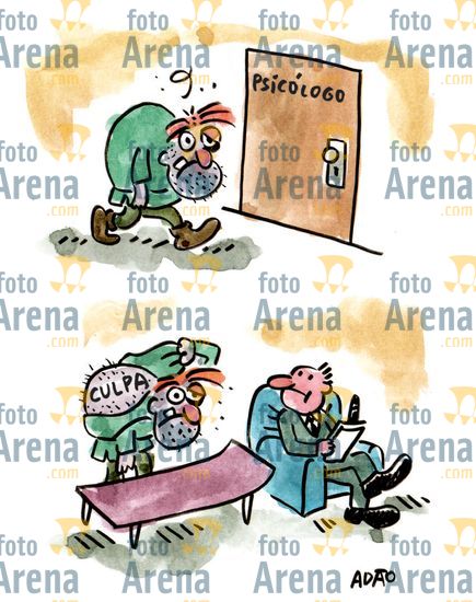 aipsic24015 ADÃO ITURRUSGARAI, PSICANÁLISE, CORREIO ELEGANTE, 28.10.2024.Sem diálogoInterpretação: Homem entra em consultório e saí com uma sacola de culpa nas costas.