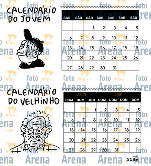 aisoc24043 ADÃO ITURRUSGARAI, SOCIEDADE, CORREIO ELEGANTE, 12.03.2024.DiálogoCalendário do jovem.Calendário do velhinho.Interpretação: O calendário do jovem, só tem sábado e do calendário do velhinho, só tem domingo.