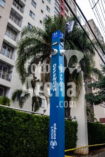2863982 Um totem de segurança privada da marca "Defender", equipado com múltiplas câmeras, opera em uma rua de São Paulo. Este tipo de equipamento privado coexiste com o sistema de vigilância pública da cidade, o "Smart Sampa", uma iniciativa da Prefeitura que visa integrar até 40 mil câmeras (públicas e privadas) para monitoramento urbano e prevenção da criminalidade. A imagem ilustra o modelo híbrido de segurança adotado na metrópole, onde a tecnologia de empresas particulares complementa os esforços do poder público, levantando discussões sobre privacidade, eficácia e o futuro da vigilância nas cidades brasileiras
