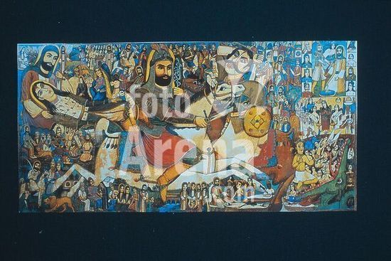 akg1674227 Arabische Welt / Schlacht bei Kerbela ( Irak), 10.Okt.680 / Sieg des Omajjaden-Kalifs Jasid I. über den Prophetenenkel Husayn). /-Die Schlacht bei Kerbela (Husayn auf weißem Pferd; links Musayn mit dem gefallenen Qasim ibn Hasan, dem Sohn seines Bruders Hasan ibn Ali).-/ Persische volkstümliche Malerei, 1900. Auf Leinwand.