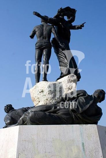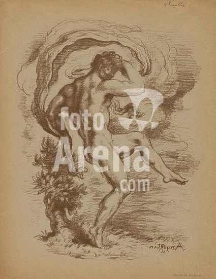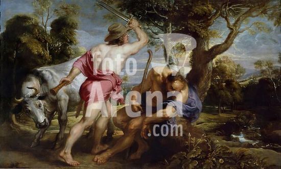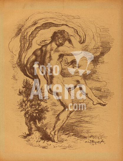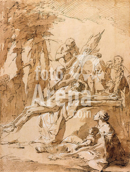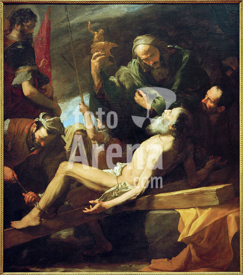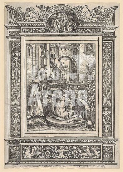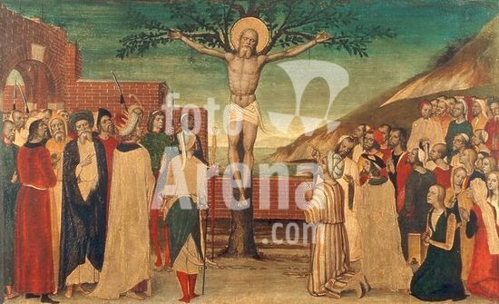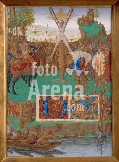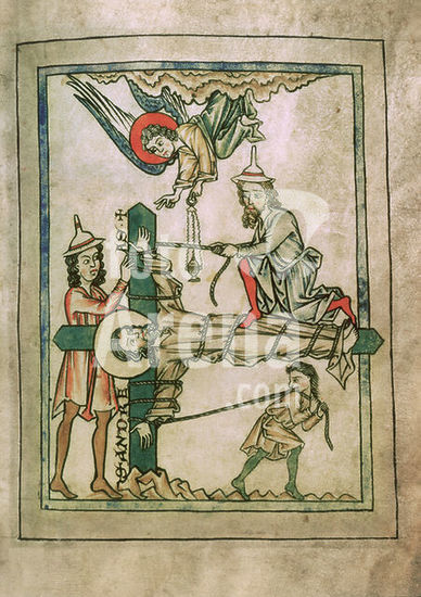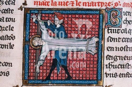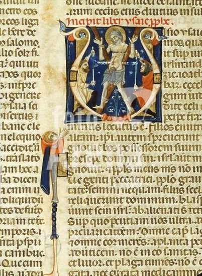 Buchmalerei, Italien, Bologna, um 1267. Historisierte Initiale "V" (Visio Isaiae filii Amos / Dies ist das Gesicht Jesajas, des Sohnes des Amos; - Jesaja 1,1): Jesaja wird zersägt. Aus einer lateinischen Bibelhandschrift. Auf Pergament. Ms. latin 22, fol. 243 v, Paris, Bibliothèque Nationale. Museum: Paris, Bibliothèque Nationale.