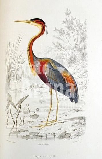akg942507 Ornithologie.-"Héron pourpré". (Purpurreiher).-Stahlstich, handkoloriert, nach Zeichnung von Edouard Traviès (1809-65). Aus: Oeuvres complètes de Buffon, Nouvelle édition, Les Oiseaux, Bd.7, Paris (A. Le Vasseur Ed.), 1884-1885. Museum: Victoria Hall Museum., UDAIPUR.