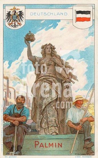 akg1636270 Geschichte: Deutschland / Germania.-" Deutschland".-Farblithographie, um 1900, nach Zeichnung von F. Schoen ( Fritz Schoen, geb.1871(?)). Sammelbildchen der Firma Palmin H. Schlinck Cie. Hamburg. Bild Nr.3 der Serie 107 "Die Hauptländer Europas". Aus einem Album.