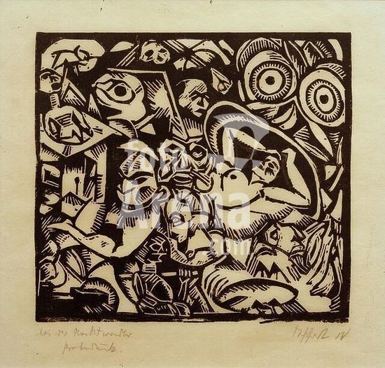 akg829733 Tappert, Georg 1880-1957. "Schlafende mit Masken", 1918. (Aus der Folge zu Theodor Däubler: "Der Nachtwandler", Nr.3). Holzschnitt, 18,7 x 20,3 cm. Schloß Gottorf. Museum: Schlesw. -Holst. Landesmuseum., Schleswig.
