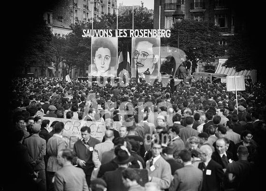 akg1127656 Rosenberg, Julius (1918-1953) und Ethel (1915-1953); USamerikanisches Ehepaar, wegen Atomspionage für die UdSSR 1951 zum Tode verurteilt und am 19.6.1953 in New York auf dem elektrischen Stuhl hingericht. /-Protestaktion gegen die Hinrichtung des Ehepaares Rosenberg auf Place de la Nation in Paris (Frankreich) am 17. Juni 1952.-/ Foto.