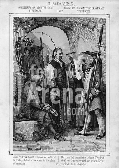 akg013937 Struensee, Johann Friedrich Graf von dän. Politiker, 1737-1772. "Der zum Tod verurteilte Johann Friedrich Graf von Struensee wird aus seinem Kerker zur Richtstätte abgeführt". (Kopenhagen, 28. April 1772). Federlithographie mit Tonplatte, 1863, von Johann Nepomuk Geiger (1805-1880), 22,4 × 15,5 cm. Berlin, Sammlung Archiv für Kunst und Geschichte. Museum: Berlin, Sammlung Archiv für Kunst und Geschichte.