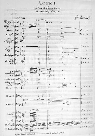akg020129 Stravinsky, Igor, Russian composer, 1882-1971. Works: Oedipus Rex (opera oratorio; libr.: Jean Cocteau aft. Sophocles; FP Paris 1927). Manuscript, page from the score: beginning of Act I.