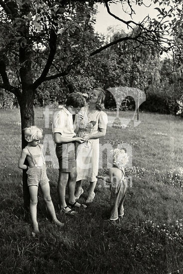 akg110102 to: Schweitzer, Hans (Herbert), pseudonym: Mjölnir or Mjoelnir. German graphic artist; from 1935 Reichsbeauftragter für künstlerische Formgebung; from 1943 draftsman in a propaganda company. Berlin 25.7.1901 - Landstuhl 15.9.1980. Wife and children of Schweitzers in the garden. Photo (Ursula Litzmann), around 1941.