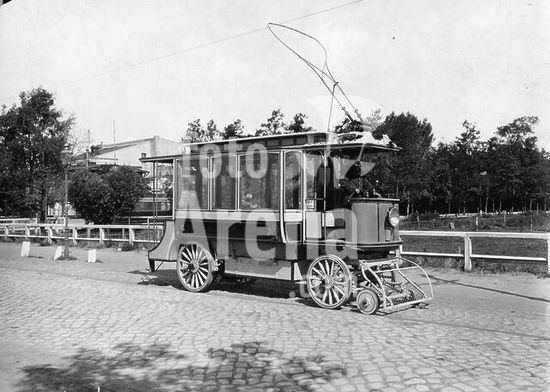 akg158743 Verkehr: Oberleitungs-Omnibus. Oberleitungs-Omnibus von Siemens & Halske, konstruiert von Max Schiemann, 1899. (Dank der Leitachse konnte der Elektro-Omnibus auch auf Straßenbahnschienen fahren und durch die Oberleitung Strom abnehmen). Foto.