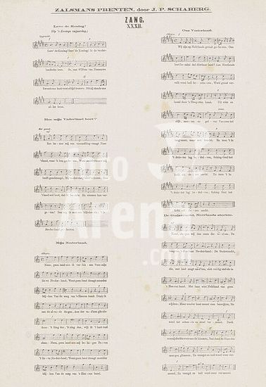Europe, Netherlands, Schaberg, JP, Kampen, Zalsman, Gerhardus Philippus, Zalmans prints, Song, verso - stamped, Sheet with sheet music for five different songs, such as 'Leve de koning!' and 'Hoe mijn vaderland heet?.' Numbered top center: XXXII., print, prent, volksprent, prints, prenten, volksprenten, height 427 mm, width 310 mm, Publication (Event), Publicatie, Nederlands, 1834 - 1910, publisher, uitgever, 1869 - 1882, paper, papier, houtgravure, letterpress printing, boekdruk, 1818-01-20 - 1903-10-09, redacteur, print maker, printmaker.