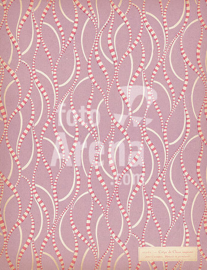 alb18727029 Fabric pattern R.11751 in printed crepe de Chine from AGB, Albert Godde, Bedin et Cie, Lyon. Modern abstract pattern with red and white striped ribbons on a pink background for tunics, blouses and decorations (pour casaques, blouses et garnitures). Handcoloured pochoir (stencil) lithograph from Art, Gout, Beaute, published by AGB, Lyon, March 1922.