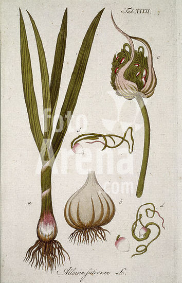 akg022811 Botany:. Knoblauch / Allium sativum. "Allium sativum L.". Copper engraving, coloured, 1813. From: (Krauss, J. C.), Verfolg op de Afbeeldingen der Artsenijgewassen. Teil 1., Amsterdam, bei I.C. Sepp u. Sohn. Author: ANONYMOUS.