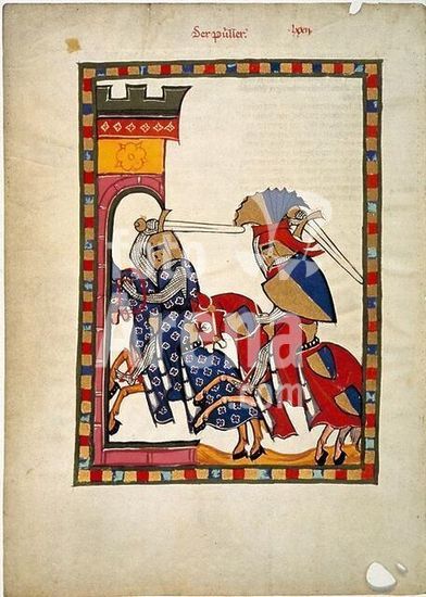 akg116712 Illumination, Zurich c. 1310-1340. Conrad the Pueller of Hohenberg (documented 1262-1315) persuiting a fleeing knight on horse. From: Große Heidelberger Liederhandschrift (Codex Manesse).Heidelberg, Universitätsbibliothek, Cod. Pal. Germ. 848. fol. 253r. Heidelberg, Universitätsbibliothek. Museum: Heidelberg, Universitätsbibliothek. Author: ANONYMOUS.