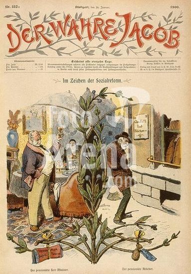 akg130882 History / Germany / Pensions. The signs of social reform: The retired minister / The retired worker. (Caricature criticising social legislation in the German Reich). From: Der Wahre Jacob, Nr. 352, Stuttgart (J.H.W.Dietz) 16th January 1900, p. 3155. Berlin, Sammlung Archiv für Kunst und Geschichte. Museum: Berlin, Sammlung Archiv für Kunst und Geschichte.
