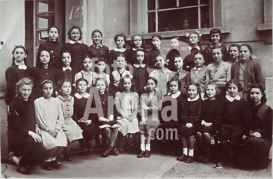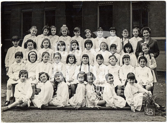 akg7279766 SCHOOL Photography souvenir of a female elementary class: 2B. The students wear all the classic white apron distinguished by a light ribbon. In the center of the first row a pair of twins appropriately posed by the photographer in order to create a choreographic mirror effect. The single teacher, posing as smiling as all the girls, managed the entire class of more than 35 students, an event not rare in the baby boom years, with the schooling set for the achievement of the diploma of eighth grade or (alternatively ) at the age of 14. The numerous successive reforms of the school have begun a period of experimentation that has led to an evolution of teaching, also decreasing the number of students per class and adding one or more colleagues alongside the owner, in order to guarantee to all schoolchildren opportunities to study, and to discourage school leaving in accordance with the increase in the age of the obligation. Group photo in the schoolyard, Milan 1968.