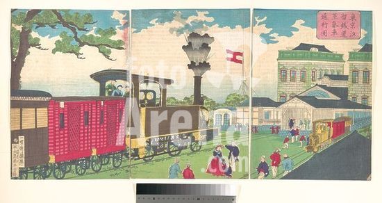 akg5048410 Utagawa Kuniteru 1830-1874. Illustration of a Steam Locomotive Passing Shiodome in Tokyo (Tokyo Shiodome testudo jokisha tsuko zu), Print, 1872. Meiji period (1868-1912). Triptych of polychrome woodblock prints; ink and color on paper, 72.4 × 36.8 cm. Inv. Nr. JP3347. New York, Metropolitan Museum of Art.