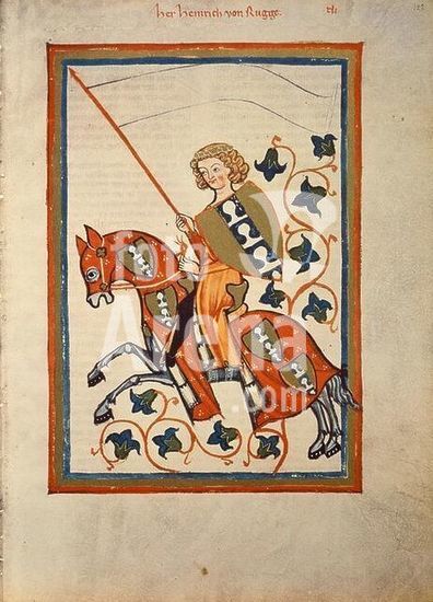 akg582161 Book illumination c. 1310-1340. Heinrich von Rugge (documented c. 1175/78) on galloping horse. Parchment. Fr.: Große Heidelberger Liederhandschrift. (Codex Manesse). Heidelberg, University Library. Cod. Pal. Germ. 848 fol. 122r. Heidelberg, Universitätsbibliothek. Museum: Heidelberg, Universitätsbibliothek. Author: ANONYMOUS.